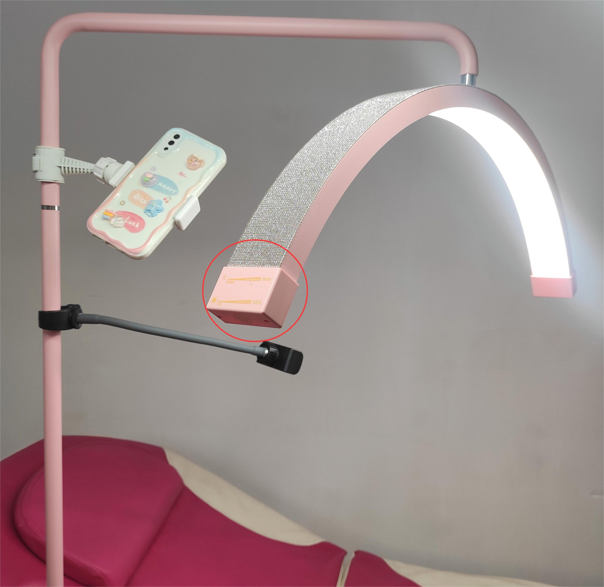 Includes a phone attachment, dimmer, adjustable height stand and also a convenient flat bottom to slide under any furniture needed! Dimmer control might be slightly different design to pictures.